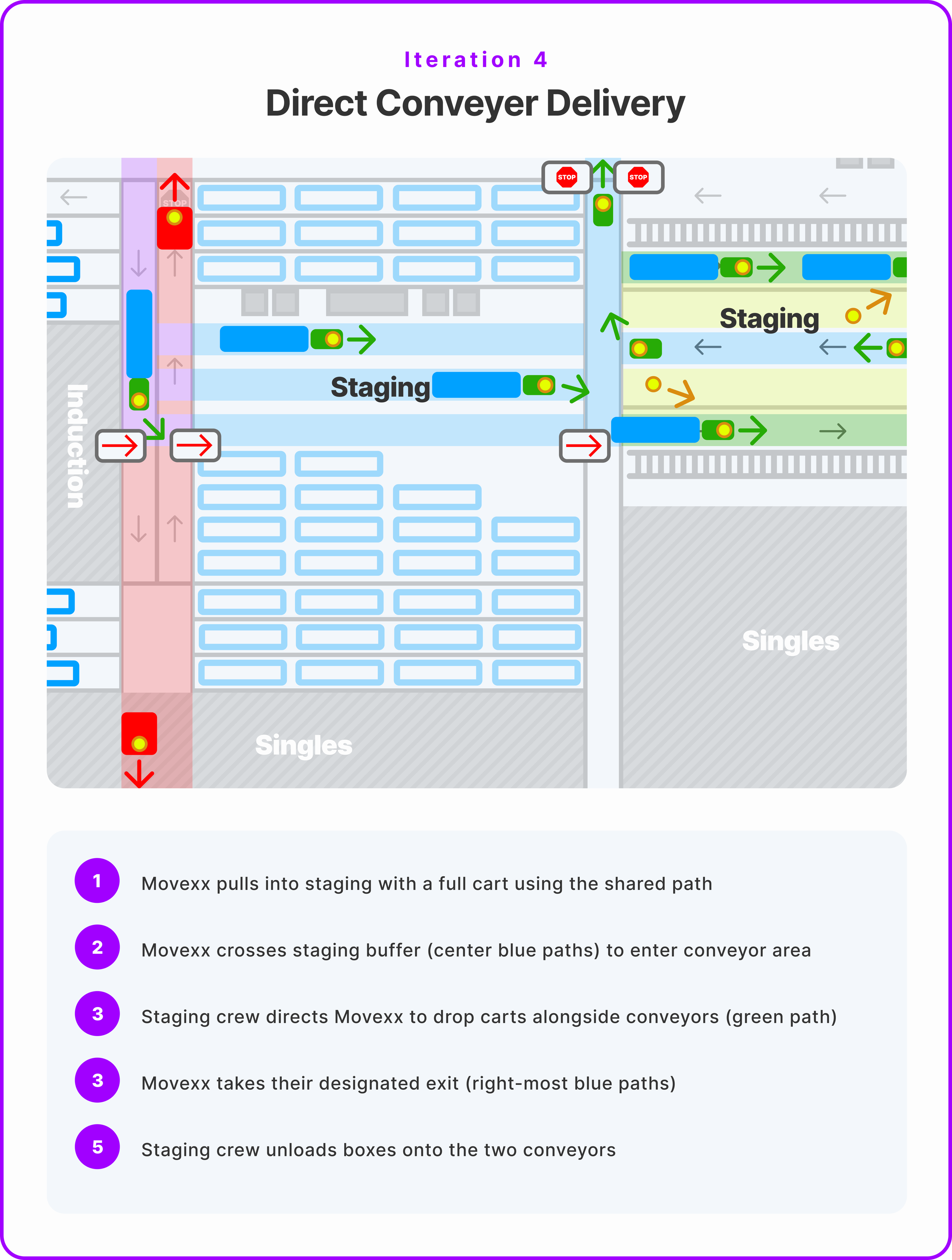 The proposal: My Operations Manager suggested: What if Movexes drive their carts ALL THE WAY to the conveyors, drop them at the conveyor edge, then exit down the middle pathway between the two conveyor lines?