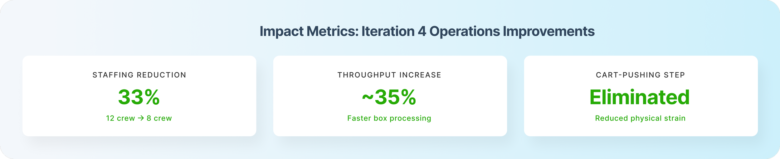 33% staffing reduction — Reduced staging crew from ~12 to ~8 (enabled by Iteration 4 efficiency gains)