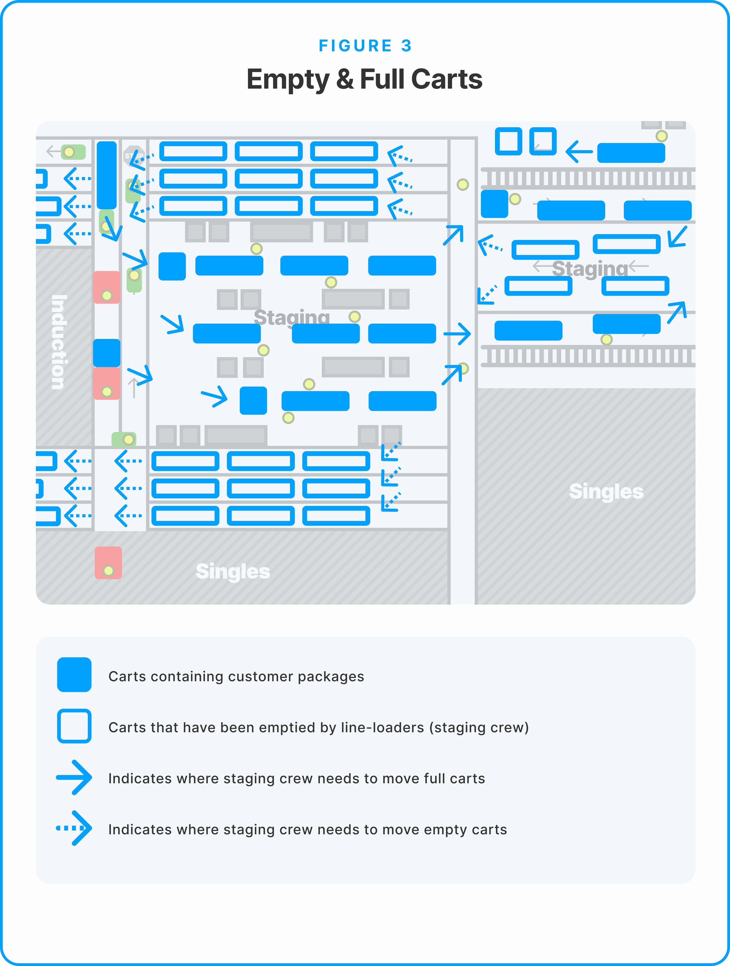 I redesigned staging's traffic flow across four iterations, culminating in a system that reduced staging staffing by 33% while improving quality scores from 40% passing to 63% passing. I also designed a batched cart audit system that monitored 30-40 carts and caught before they reached customers—preventing an estimated 15-20% of potential customer concessions.