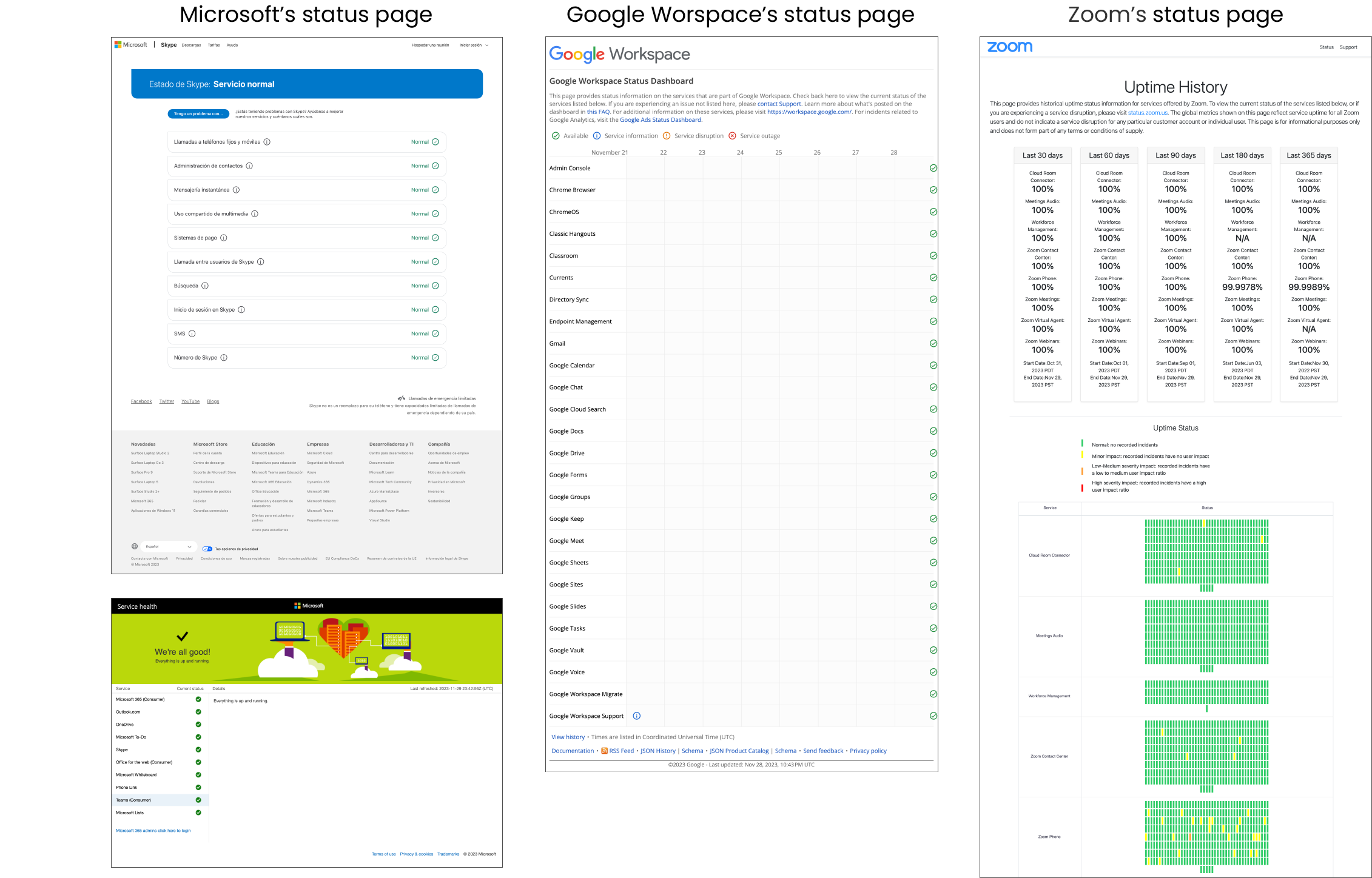 In order to shave additional time off of this project without sacrificing our users’ needs, I opted for lightning demos as a way to use tried-and-true design elements in my project. I referenced uptime pages from Zoom, Microsoft, and Google Workspace to find UI elements that would meet the user needs that were outlined by the stakeholders. Here are the aspects of those websites that I found useful for RingCentral’s users: