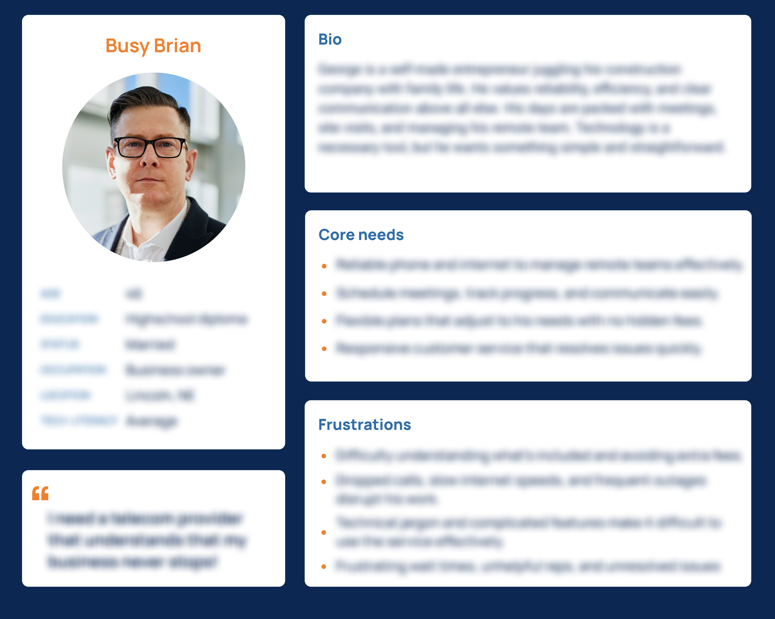 With the information I learned, I was able to generate the user persona pictured above to serve as a representative of our target users. This would be a guide for this project as well as future RingCentral projects. Please don’t ask about the blurred out information, as I am trying to avoid getting taken out by the NDA assassins.